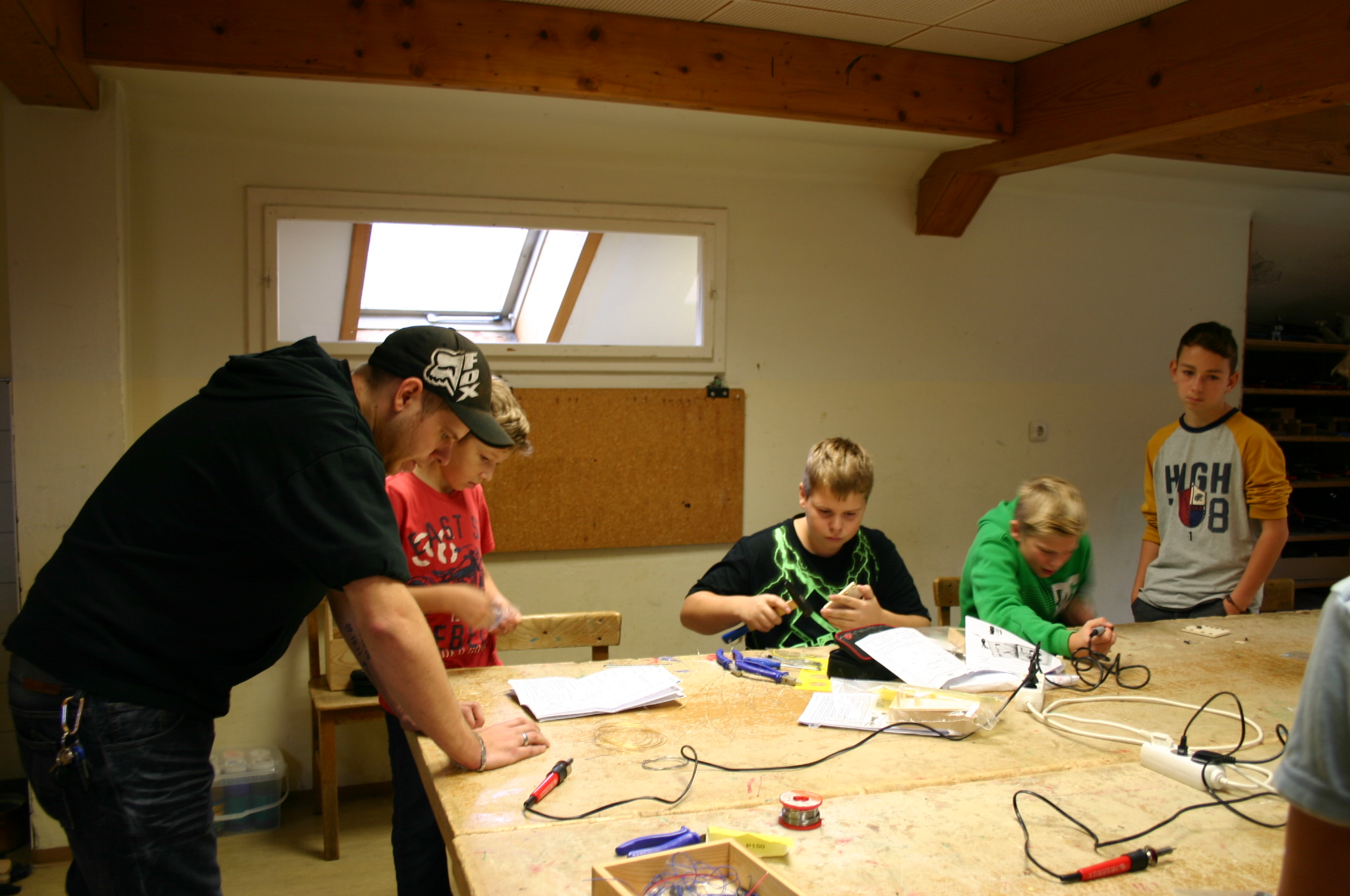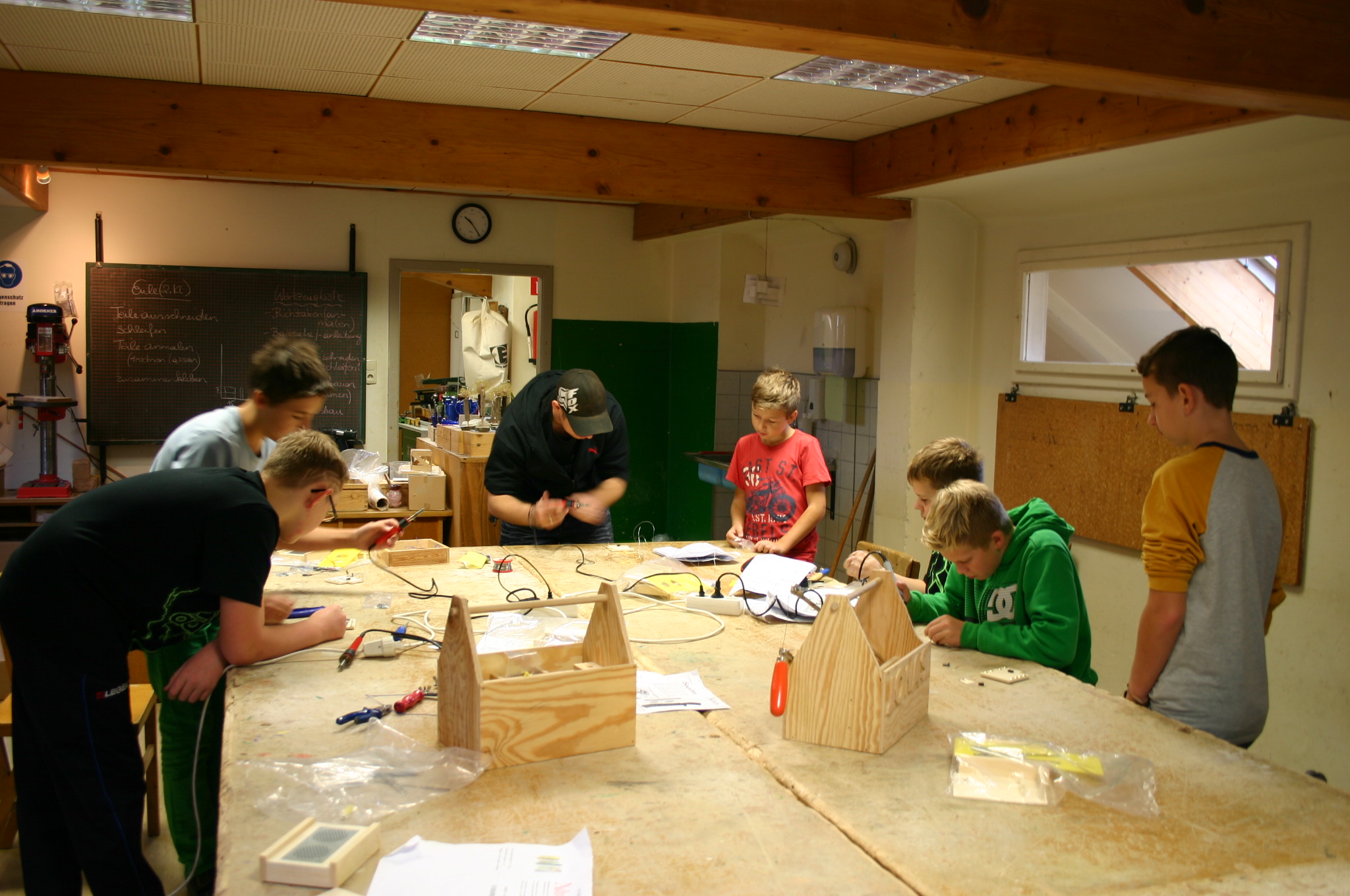 Die Schüler der 3. Klasse stellten im Werkunterricht eine Sound Box mit integrierter Verstärkerschaltung für Handys her. Die Holzkonstruktion war schnell gebaut. Eine besonders große Herausforderung war jedoch die Verstärkerschaltung, die viele Lötvorgänge benötigte. Patrick Schmid (sein Bruder Manuel ist Schüler der 3. Klasse) unterstützte die Schüler fachmännisch bei ihrer Arbeit und hatte einen großen Anteil am Gelingen. Danke Patrick für deine Geduld und die vielen Stunden Hilfe. |