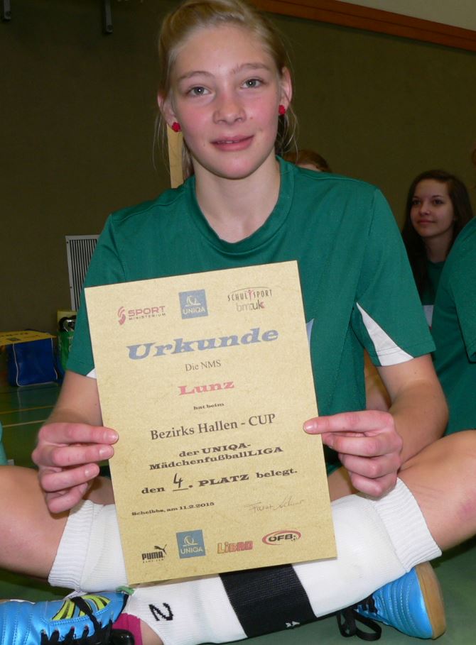 Am 11.2.2015 fand erstmals ein Fußball Hallenturnier für Mädchen im Bezirk Scheibbs statt. Insgesamt fünf Mannschaften nahmen daran teil, gespielt wurde in der Turnhalle der Sportmittelschule Scheibbs. Unser Team bestand aus 12 Mädls der 3. und 4. Klasse, welche mit großer Begeisterung dabei waren. Nachdem das erste Spiel noch etwas holprig verlief, konnte sich unsere Mannschaft (oder Frauschaft?) steigern und im 3. Spiel gelang uns in einem packenden "Derby" gegen Gaming der erste Punkt! Im letzten Match gegen den Turniersieger aus Steinakirchen erkämpften unsere Mädchen immerhin ein beachtliches 0:3. So konnten wir insgesamt den 4. Platz belegen. Der einstimmige Damenchor nach der Siegerehrung: "Können wir so etwas wieder einmal machen?"