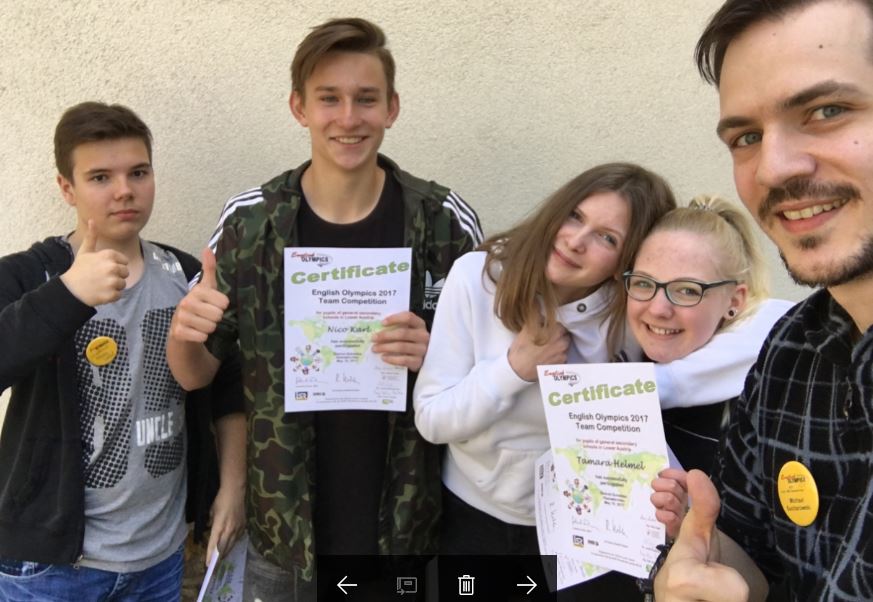 Am Mittwoch, den 10.5.2017, standen die diesjährigen English-Olympics in Steinakirchen auf dem Programm. Begleitet von ihrem Englischlehrer Herrn Sucharowski, nahmen Tamara Helmel, Johanna Schnabel, Nico Karl und Elias Stibl daran teil. Bei verschiedenen Stationen mussten sie ihr Allgemeinwissen und ihre Teamfähigkeit unter Beweis stellen und das alles natürlich in englischer Sprache. Unsere SchülerInnen haben unsere Schule wunderbar vertreten und erfolgreich an der Olympiade teilgenommen. Herzlichen Dank den Englischlehrern Frau Scharner und Herrn Sucharowski für die Vorbereitung und unserem Team für die Teilnahme. |