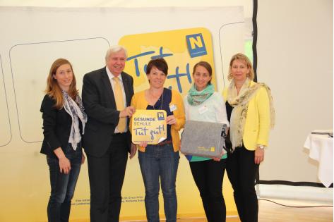 (v.l.nr.: Mag.a Renate Reingruber; Prof. Mag. Johann Heuras; Gesunde Schule-Beauftragte und Stv. Elisbeth Simetzberger und Nicole Jagersberger; Mag.a Petra Leitner-Braun, MA)