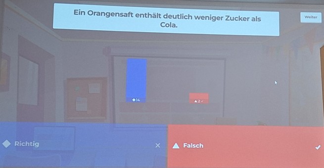 So wurde nach dem Durchspielen eines Kahoot-Quizzes z.B. darüber gesprochen, wie viel Zucker in Softdrinks vorhanden ist, wie viel man täglich trinken (am besten Wasser oder ungesüßten Tee) soll usw.