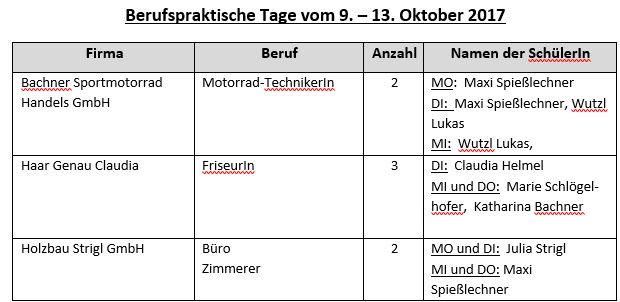 Am Freitag, den 13.10., sind die SchülerInnen in der Schule um ihre Portfolio-Arbeiten zu erstellen und den BO-Abschlussabend (vorauss. am, den 17. Nov. 2017 um 19.00 Uhr in der Bibliothek) vorzubereiten.