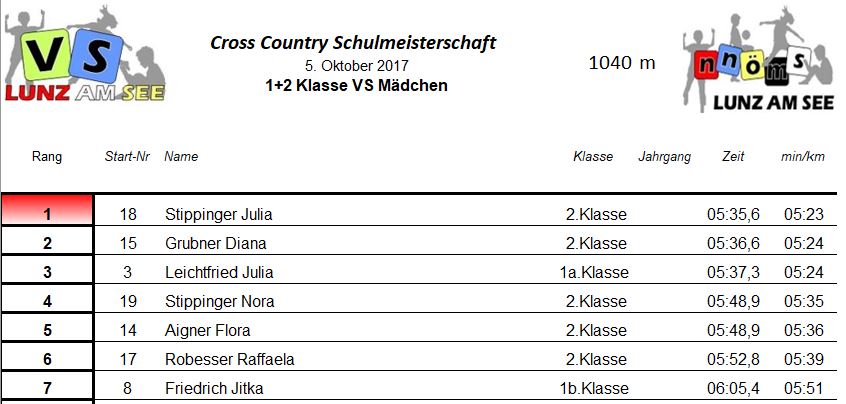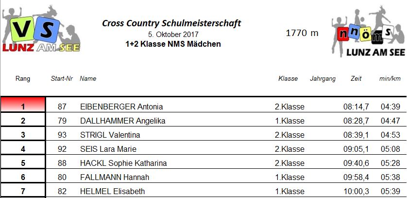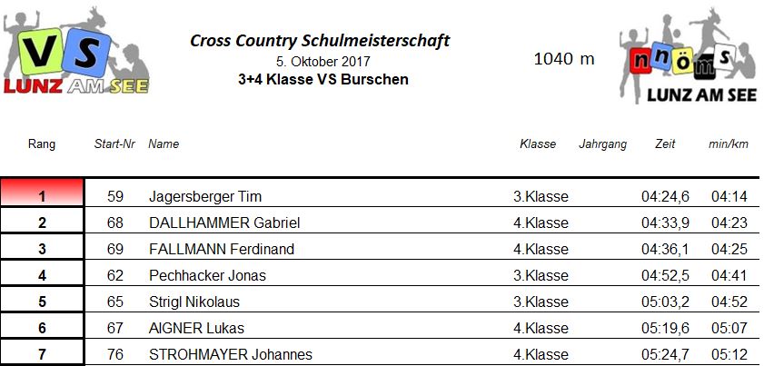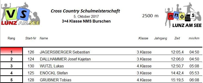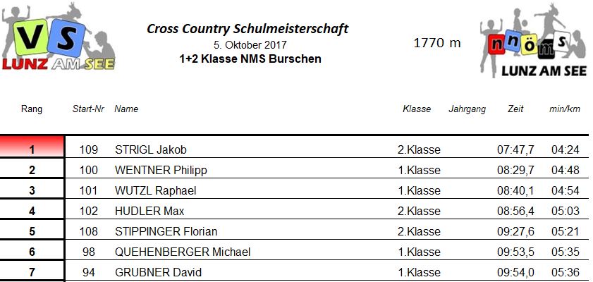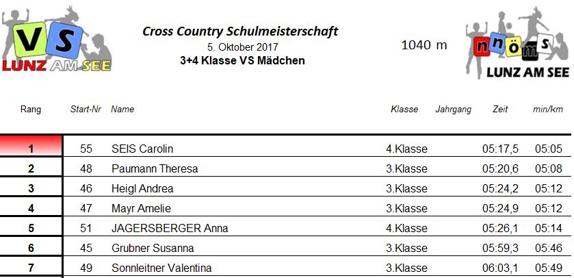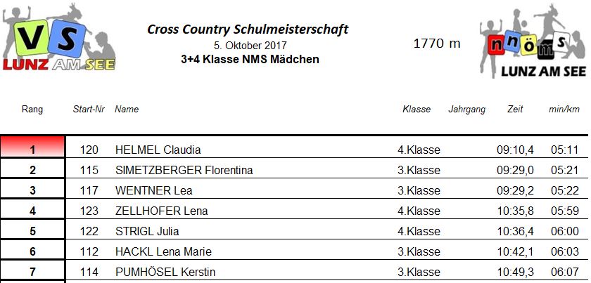 Am 5.10.2017 führten wir zum bereits 5. Mal unsere Cross Country Schulmeisterschaft auf dem Grundstück der Familie Gansterer mit Start und Ziel auf dem Seeparkplatz durch. In insgesamt 8 Klassen wurden gemeinsam mit der VS Lunz die Schulmeister ermittelt.