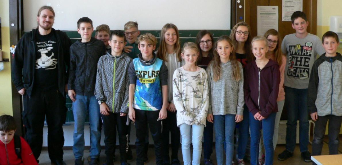 Die 2. Klasse mit unserem Vortragenden. Auch die Mädchen waren mit Begeisterung bei der Sache. |
