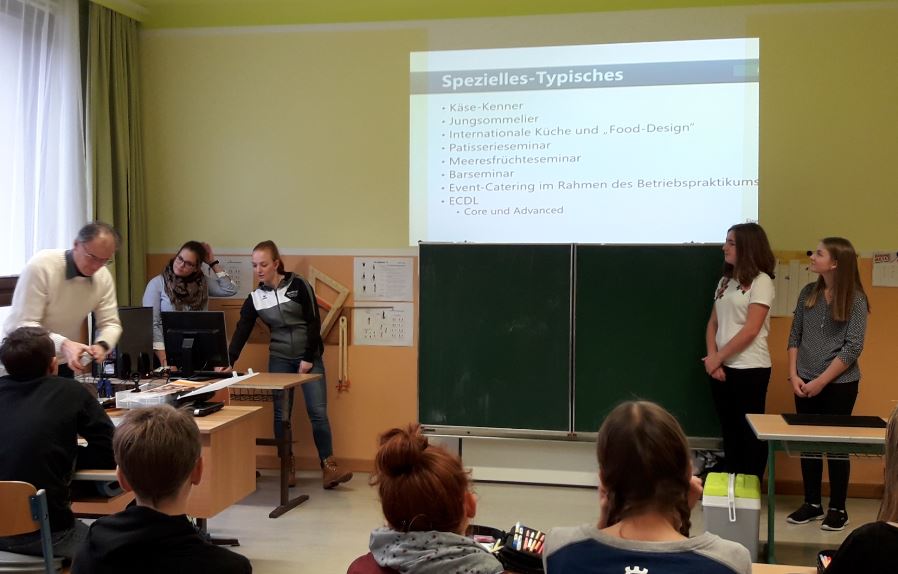 Am Mittwoch, den 29.11.2017, kamen die SchülerInnen der 3. und 4. Klasse NMS wieder in den Genuss einer gelungenen Schulpräsentation der BBS Weyer. Fünf ehemalige Schülerinnen der NMS Lunz präsentierten ihre verschiedenen Schultypen (HLW, HLT,….) , gingen auf Fragen der Schüler ein und mixten dann auch noch Cocktails, welche die Schüler und Schülerinnen verkosten durften. Dies alles geschah unter den wachsamen Augen des Bildungsberaters Hr. Mag. P. Ramsmeier – der mit der Präsentation seiner Schülerinnen sehr zufrieden war. Er ermutigte unsere Schüler, auch nach Weyer in die HLW zu gehen und versprach, auch nächstes Jahr wieder gerne Gast bei uns an der NMS Lunz zu sein. Danke für diese nun schon langjährige, gute Zusammenarbeit!