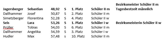 Jagersberger Magdalena (9.), Stippinger Florian (10.), Wentner Lea (10.), Friedrich Juliane (11.), Fallmann Hannah (14.), Schachner Matthias (14.), Aigner Tamara (15.), Wutzl Raphael (15.), Quehenberger Michael (18.), Wutzl Lukas (21.), Fressner Sophie (22.), Strigl Jakob (41.), Sollböck Michael (46.), Müller Christoph (47.)