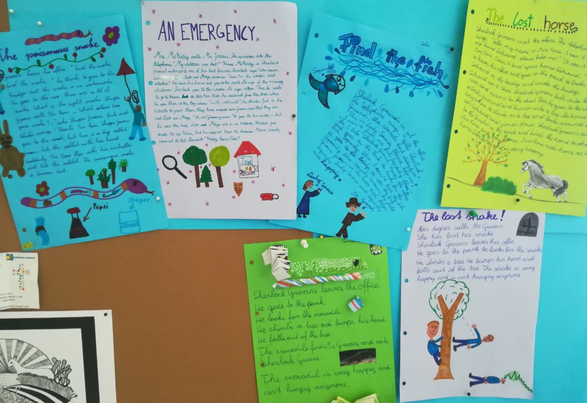 Im Englischunterricht der 1. Klasse verfassten die Kinder unter Anleitung ihrer Englischlehrer Frau Reiter und Herrn Sucharowski Texte in Anlehnung an die Geschichte von "Sherlock Groans". Die fertigen Produkte sind im 1. Stock zu bewundern.
