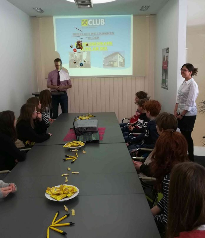 Wie jedes Jahr freuten sich auch heuer die Schüler/innen der 3. NMS, dass sie von unserer Raika-Bankstelle zu einem Besuch eingeladen wurden. Nach einer umfassenden Information über die verschiedensten Aufgabenbereiche wurden die sehr interessierten Schüler, welche von Frau Schneckenleitner Josefine begleitet wurden, in zwei Gruppen durch das Bankgebäude geführt. So durften sie in die geheimsten Winkel unserer Bankstelle spähen, dabei führte sie ihr Rundgang sogar bis auf den Dachboden, der auch eine wichtige Funktion hat. Ein besonderes Highlight war natürlich der Moment, als sich die allergeheimste Tür der Bankstelle für sie öffnete – nämlich die Tür zum Tresorraum! Es war schon ein eigenartiges Gefühl, in diesem besonderen Raum zu verweilen und auch einmal so viel Geld anfassen zu dürfen. Sehr interessant waren auch die Informationen im Schalterraum, dabei wurde allen sogar ermöglicht, das Beheben von Geld beim Bankomat auszuprobieren. Dass Geld auch ein ordentliches Gewicht hat, stellten die Schüler/innen bei einem Schätzspiel fest, bei dem ein ziemlich schwerer mit Münzen gefüllter Geldsack hoch gehoben wurde und es musste der Wert der Münzen geschätzt werden. Die Gewinnerinnen, die dem richtigen Betrag mit ihrer Schätzung am nächsten waren, wurden mit netten Preisen belohnt. Zum Abschluss wurden die Schüler/innen noch mit einer Jause verwöhnt, bevor sich die Klassensprecherin für den sehr lehrreichen und informativen Besuch bedankte. |