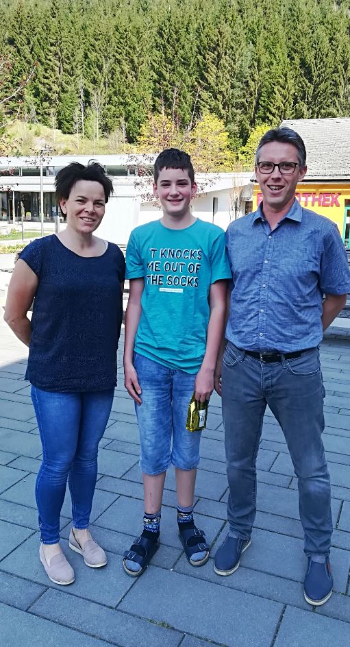 Foto: Frau Simetzberger (KV und Mathematiklehrerin sowie Herr Direktor Holzgruber mit Michael bei der schulinternen Ehrung im Schulhof) |