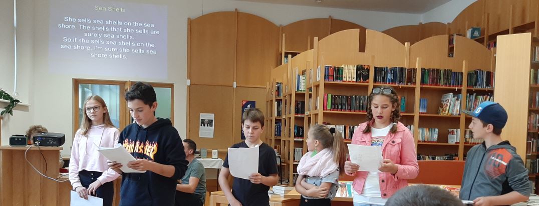Am Freitag fand die abschließende Präsentation in der Bibliothek statt, zu der auch die Eltern recht herzlich eingeladen waren. Die Schülerinnen und Schüler der 3. Klasse zeigten ein kurzweiliges Programm bestehend aus Sketches, Fotoshows und verschiedenen "Tongue Twisters".