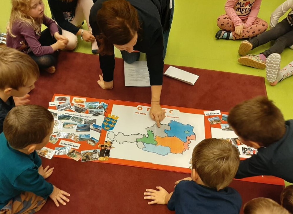 Ein gemeinsames Projekt der 3 Bildungseinrichtungen (KIGA, VS und NMS)Die 3. Klasse der neuen Mittelschule verfasste im Unterricht mit Frau Nicole Jagersberger Texte zu den neun Bundesländern. Außerdem recherchierten die Schülerinnen und Schüler im Internet und druckten zu jedem Bundesland Bilder der bekanntesten Sehenswürdigkeiten aus. Diese Bilder und die Texte in Briefform wurden von Peter und Tiggy, zwei großen Stofftieren, und je zwei Schülerinnen und Schülern der 3. Klasse jeweils montags in den Kindergarten gebracht (Foto 1). Dort warteten die Vorschulkinder schon immer sehr gespannt, was sie alles Neues erfahren würden. Die NMS-Schüler lasen den KIGA-Kindern die Briefe vor und brachten das jeweilige Bundesland als „Puzzle-Teil“ und die ausgedruckten Bilder mit. Die KIGA-Kinder gestalteten mit ihren Pädagoginnen Frau Holzgruber, Frau Huber und Frau Stockinger so im Laufe der Zeit ein wunderschönes Österreich-Plakat (Foto 2). Außerdem lernten die Kinder ein Gedicht und ein eigens getextetes Österreich-Lied. Gemeinsam mit Frau Lechner und der 2. Klasse der Volksschule entsteht im Moment in mehrmaligen Kooperationstreffen ein Stop-Motion Film mit selbst gemalten Bildern und vorgelesenen Texten zu den neun Bundesländern. Dazu erstellte Frau Lechner ein Storyboard und mit Hilfe der NÖ-Media Trickbox und dem MovieMaker wird an dem Film "gebastelt". |