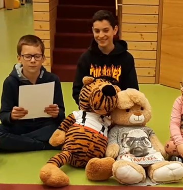Zwei Schüler der 3. Klasse kommen mit Peter und Tiggy in den Kindergarten
