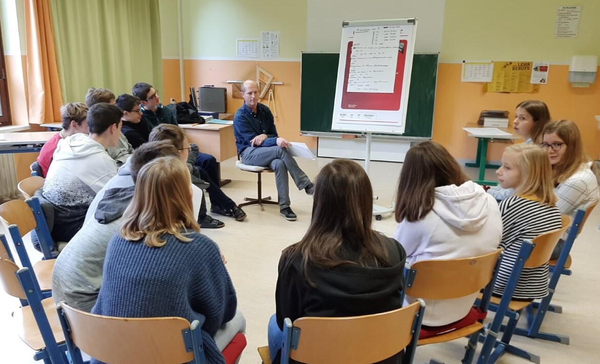 Herr Strobelmayr mit der 4. Klasse beim Besprechen des Jugendschutzgesetzes.
