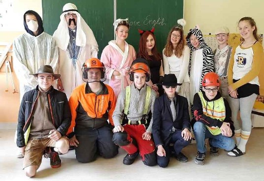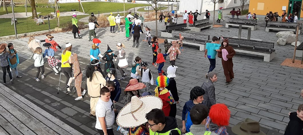 Schon vor dem Umzug ging es heuer lustig los. Gemeinsam zogen die Schüler/innen und ihre Lehrer/innen polonaiseartig durch die beiden Schulgebäude und über den Schulhof.