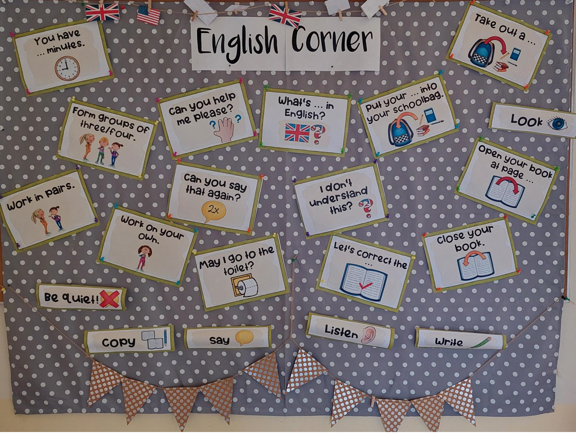 Gleich zu Schulbeginn hat unsere Englisch-Koordinatorin Frau Reiter den "English-Corner" im 1. Stock mit wichtigen "Classroom-Phrases" befüllt. Im Laufe des Schuljahres wird der "English-Corner" von unserem Englisch-Team Frau Reiter, Frau Reichhuber und Herrn Sucharowski immer wieder aktualisiert und auch besonders gelungene Schülerarbeiten finden hier den gebührenden Platz.