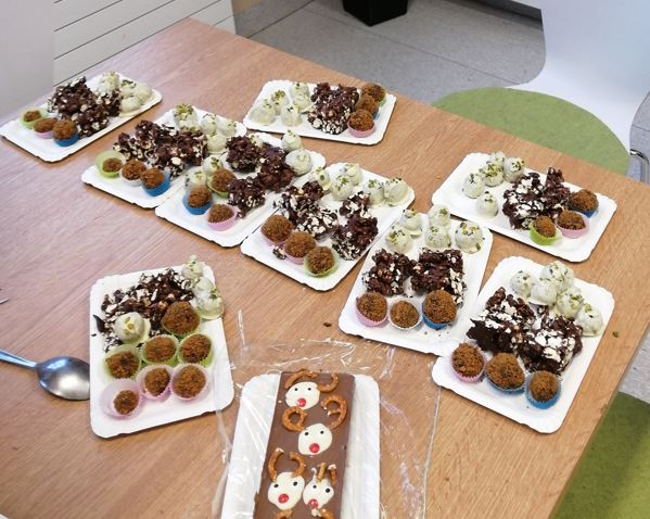 Der zweite Teil des Konditorworkshops stand ganz im Zeichen der Praline. Die SchülerInnen bereiteten unterschiedliche Süßwaren zu. Oreo-Pralinen, Spekulatius-Pralinen, Himbeer-Kokos-Pralinen, gebrannte Raffaello-Mandeln und Popcorn-Würfel wurden gefertigt. Zwischendurch bestand die Möglichkeit, eine weihnachtliche Bruchschokolade zu kreieren. Köstliche und wirklich ansehnliche Leckereien sind dabei entstanden. Herzlichen Dank für die Kostprobe, die ich in meinem Büro gefunden habe! |