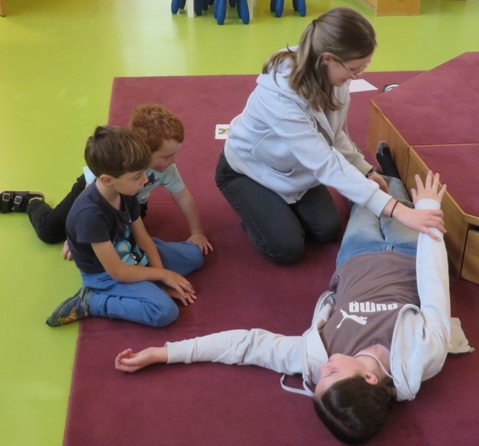 Am Montag, den 5.5.2025, war die 4a Klasse gemeinsam mit Roko, dem "Erste-Hilfe-Maskottchen" und begleitet von Frau Gamsjäger und Frau Reiter im Kindergarten, um ihr Wissen an die Vorschulkinder des Kindergartens weiterzugeben. Zuvor hatten die NMS-Schülerinnen und Schüler selbst einen Erste-Hilfe-Kurs absolviert und gemeinsam mit Erste-Hilfe-Beauftragter Frau Gamsjäger die Unterrichtseinheit und diverse Stationen vorbereitet. Ergänzt wurden die Stationen durch zusätzliches Material des Kindergartenteams. Nach einer gemeinsamen Einleitung wurden die KIGA-Kinder in 2er-Teams eingeteilt. In insgesamt sechs Stationen unterrichteten die Großen die Kleinen zu Themen wie: