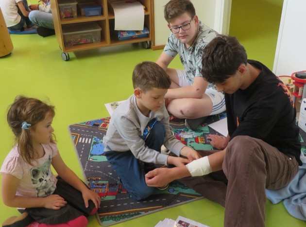Auf den beiden Fotos und im Album kann man sehen, mit welchem Eifer die Kinder und Schülerinnen und Schüler bei der Arbeit waren und wie gut die Großen den Kleinen Wichtiges zum Thema "Erste Hilfe" näher brachten. Herzlichen Dank an alle Beteiligten für dieses wirklich gewinnbringende Nahtstellenprojekt!