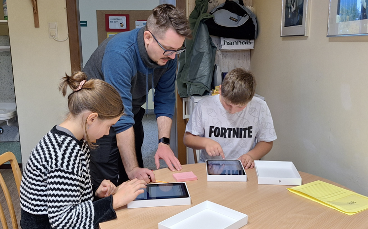 Herr Sucharowski mit zwei Kindern der 1. Klasse beim Einrichten ihrer iPADs