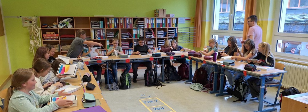 Herr Sucharowski nahm mit den Kindern die iPADs am Montag erstmals gemeinsam in Betrieb und weitere Einstellungsarbeiten wie das Anmelden in der TEAMS-Plattform, das Verbinden mit dem Server oder das Einrichten der E-Mail Accounts wurden durchgeführt. Ab Dienstag können die Geräte dann für den Unterricht verwendet werden.
