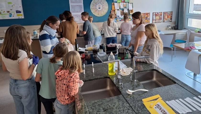 Die Kinder erforschten die Inhaltsstoffe von gängigen Kosmetik- und Drogerieartikeln und beschäftigten sich auch mit der Herstellung einiger Produkte (Lippenbalsam, Peeling, ...). Wer geschickt war, konnte auch selbst einen neuen Duft erfinden. Die Gruppe beschäftigte sich nämlich auch damit, wie man Duftstsoffe aus Pflanzen herauszieht und danach wieder in z.B. eine Creme hineingeben kann. |