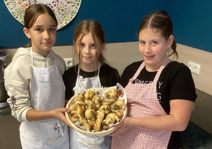 7. Kochtag, 3. Klasse, 20.2.2025 Heute hatten wir als Vorspeise eine helle Gemüsesuppe mit Kaspressknödel. Als Hauptgericht gab es überbackene Schinkenfleckerl und als vegetarische Variante Tortelliniauflauf mit buntem Salat. Zum Abschluss gab es eine Schokocreme mit Früchten und Blätterteigherzen. - Bericht von Manuel St. und Pia - |