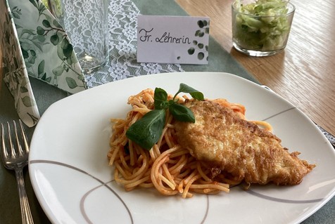 Unser leckeres Mittagessen haben wir neben einer sehr schönen, frühlingshaften Tischdeko genossen. - Bericht von Anton und Mirjam - |