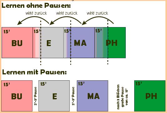Lernt man verschiedene Fächer hintereinander ohne Pausen, überschneiden sie sich und einige Informationen gehen wieder verloren, da dein Gehirn eine gewisse Zeit braucht, um alles zu speichern. Deshalb solltest du nach spätestens 15 Minuten unbedingt eine kurze (2-3 Minuten genügen) Lernpause einlegen. Gehe an die frische Luft, trinke ein Glas Wasser (dein Gehirn wird es dir danken) oder mache einige einfache Turnübungen (Kniebeugen, Situps,...). Erst dann ist auch dein Gehirn wieder fähig, Neues aufnehmen und speichern zu können. Nach 3 Blöcken sollte die Pause ca. 15 Minuten betragen. Natürlich kann man auch 2 oder mehrere Blöcke hintereinander ein Fach lernen. Dann sollte man allerdings immer am Beginn eines neuen Blocks das vorher Gelernte wiederholen. Nach dem Lernen sollte man am besten nicht mehr fernsehen, da besonders Actionfilme viel von dem vorher Gelernten wieder "löschen" können.